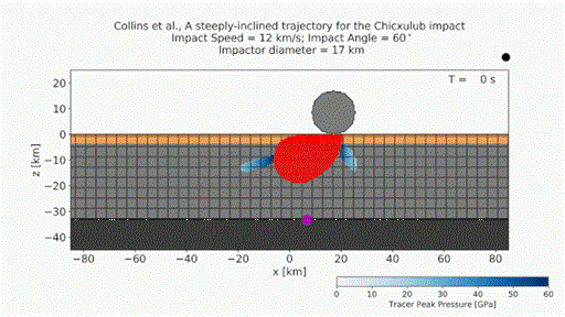 小行星撞击角为 60°时,陨石坑的演变情况,这与Chicxulub陨石坑周围陨石的分布和地下近 30km 的不对称结构相吻合。该小行星撞击地球的模拟示意图丨Gareth Collins