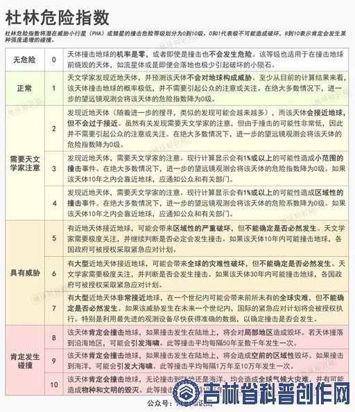 1999 年,国际小行星联合会(MPC)为了促进公众对小行星撞击危险的认识和监测,将小天体撞击危险预测进行了分类:从 0-10,表征了可能撞击事件的概率和后果。详见下表。