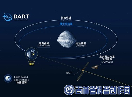 DART 任务将航天器在距离地球约 1100 万千米处,以约 3.6km/s 的速度撞向迪莫弗斯,并成功将其绕行迪迪莫斯的 12 小时轨道周期缩短了约 32 分钟。