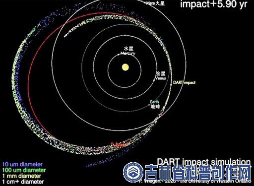 DART 任务在撞击后,对尘埃尾的动力学模拟,用不同颜色标注了不同直径尘埃颗粒的演化轨迹丨Wiegert