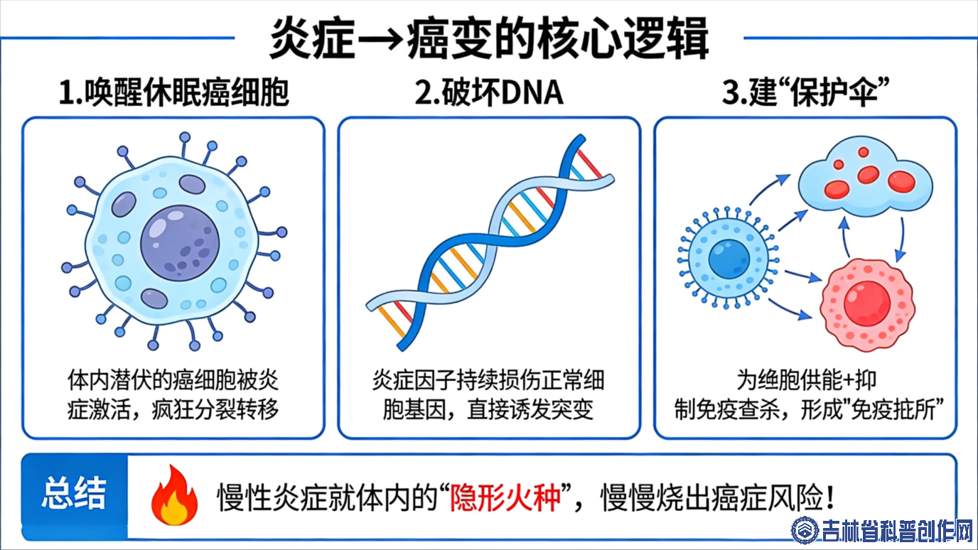 2. 破坏 DNA:炎症因子持续损伤正常细胞基因,直接诱发突变;