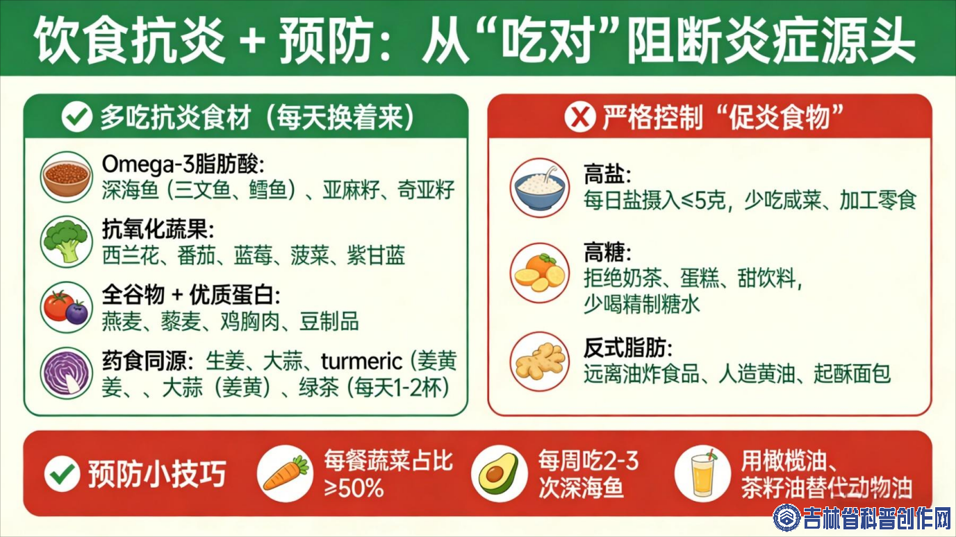 结合中西医结合护理、营养、心理、康复多专业经验,给大家最落地的建议,不仅 “抗炎” 更 “防炎”:1. 饮食抗炎 + 预防:从 “吃对” 阻断炎症源头
