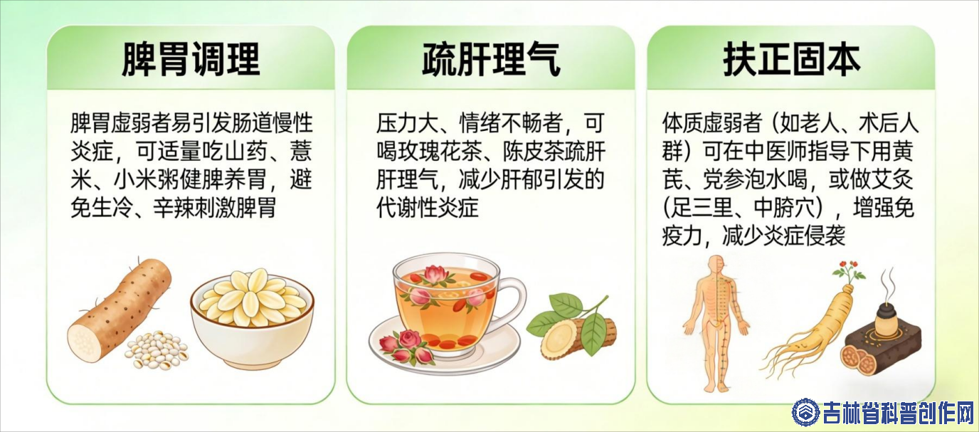 l 扶正固本:体质虚弱者(如老年人、术后人群)可在中医师指导下,用黄芪、党参泡水饮用,或通过艾灸足三里、中脘穴等方式,增强机体免疫力,降低炎症侵袭的风险。